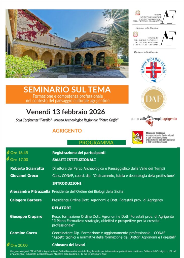 HomeFormazioneSeminario ODAF di Agrigento – venerdì 13/02/2026 Seminario ODAF di Agrigento – venerdì 13/02/2026 12 Febbraio 2026 “Formazione e competenze professionale nel contesto del paesaggio culturale agrigentino”